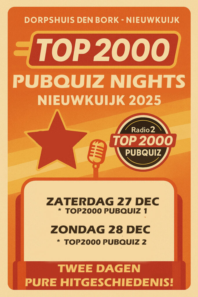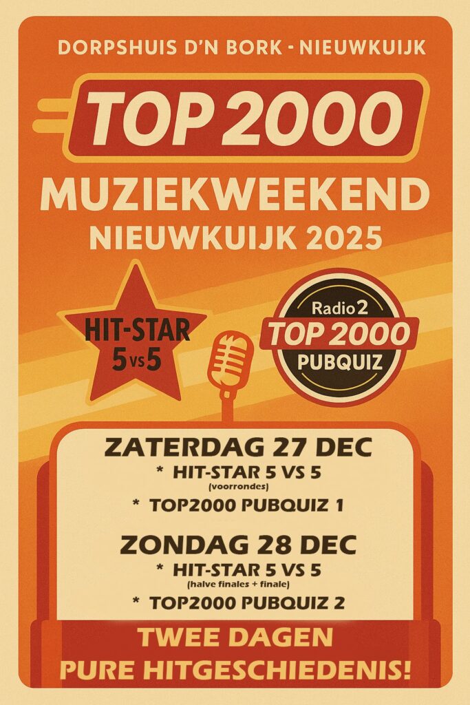 Op 27 en 28 december veranderd Dorpshuis den Bork in het Top2000 Café. Een heel weekend gegarandeerd de beste hits en pure gezelligheid.