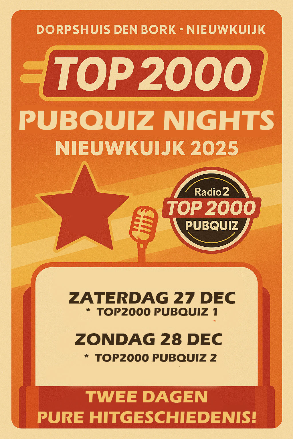 Top2000 Pubquiz Nights in Nieuwkuijk! Op 27 & 28 december verandert Dorpshuis den Bork in hét muziekhart van de regio. Met twee totaal verschillende Radio 2 Top2000 Pubquizzen.